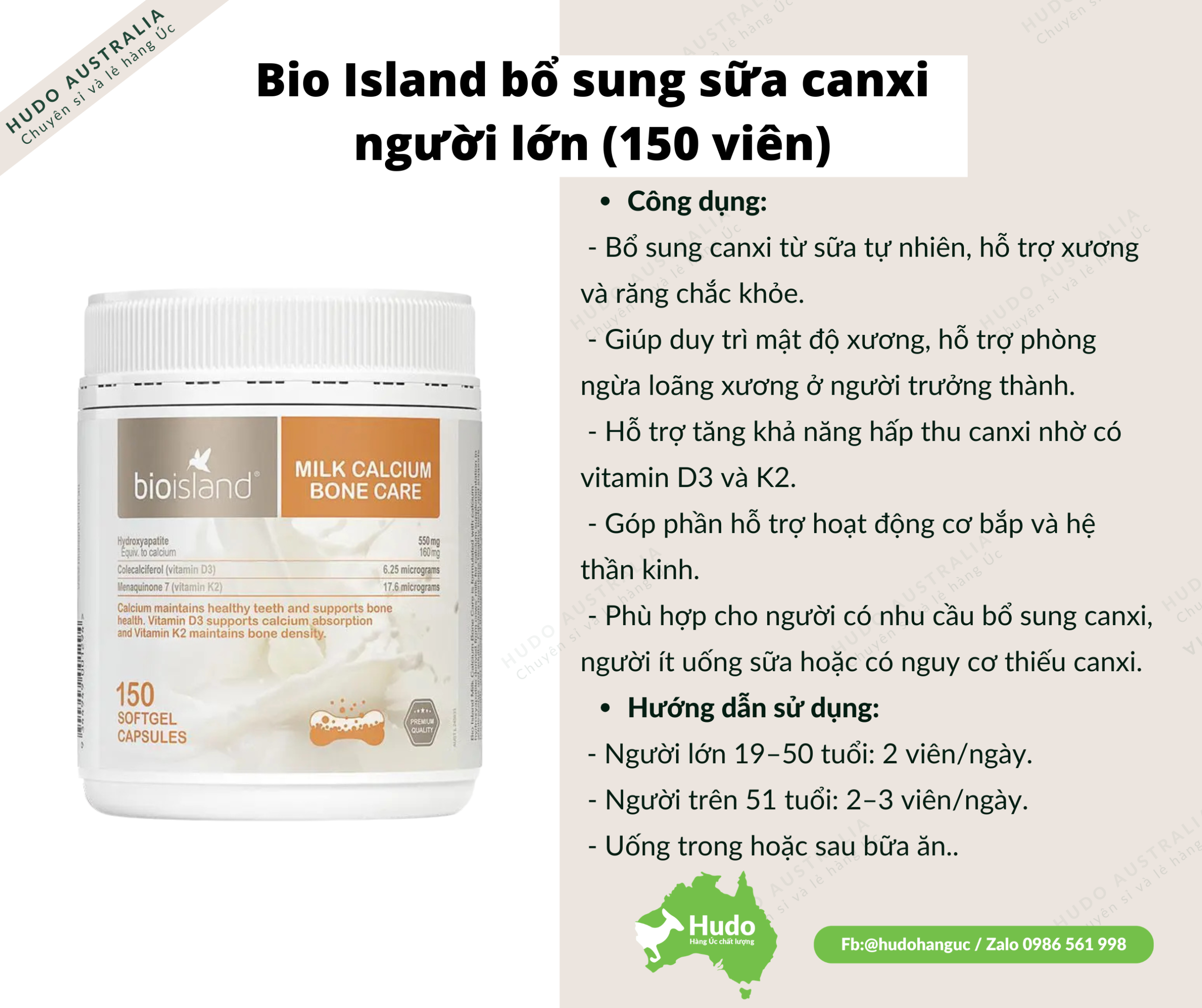 Viên sữa bổ sung canxi Bio Island Milk Calcium Bone Care giúp chăm sóc sức khỏe của xương và răng bằng cách cung cấp canxi, vitamin d3, vitamin K2 từ chiết suất sữa bò nguyên chất. Sản phẩm dành cho thanh thiếu niên và người lớn, an toàn tuyệt đối cho sức khỏe, không gây tác dụng phụ.